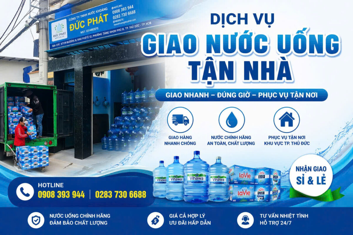 Giữa hàng trăm đơn vị cung cấp nước uống trên thị trường, Đức Phát khẳng định vị thế bằng chất lượng sản phẩm chính hãng và sự tận tâm trong dịch vụ giao nước uống tận nơi. Chúng tôi chuyên cung cấp các dòng nước uống đóng bình (19L, 20L) và nước đóng chai đa dạng dung tích tại khu vực các phường ở TP. Thủ Đức cũ và toàn TP.HCM.